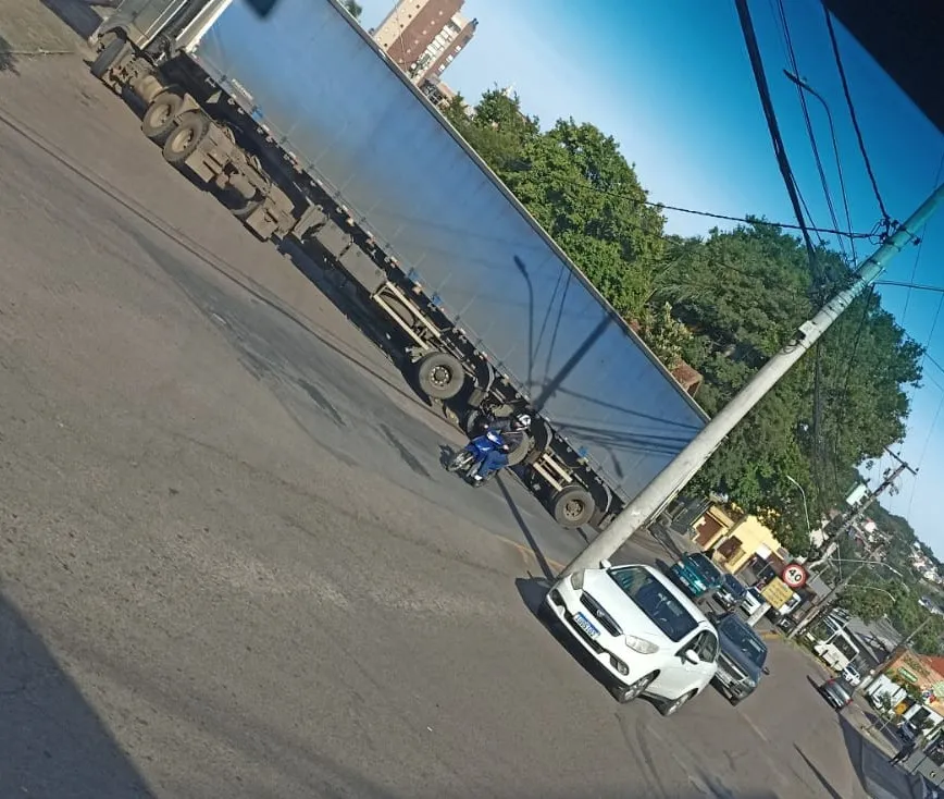 Carreta faz “L” em rua de Bento e prejudica trânsito por quase 10 horas
