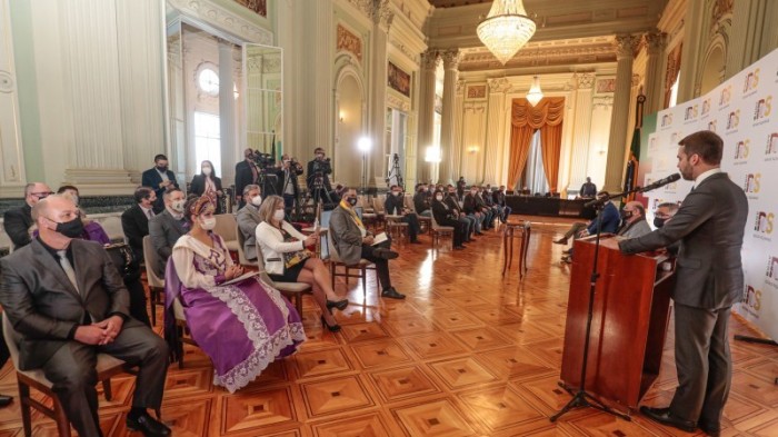 O governador Eduardo Leite sancionou, na manhã desta quinta-feira (8/7), cinco projetos de lei de autoria de deputados estaduais e três que foram propostos pelo Poder Judiciário.