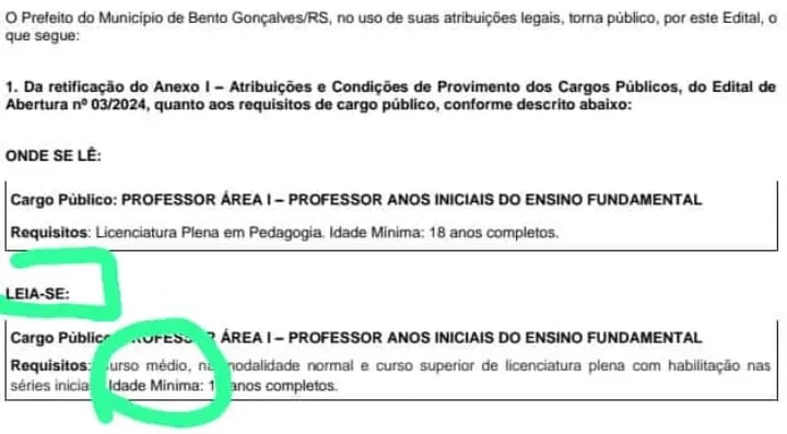 No edital 03/2024, que já tinha uma retificação, a publicação errou os requisitos para o concurso de Professor Área I - Anos Iniciais do Ensino Fundamental.