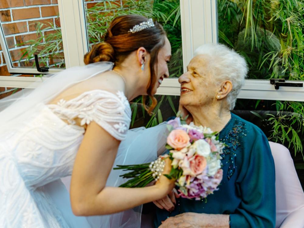 Vestida de noiva, Caterina Royer se encontrou com a avó, de 87 anos, a qual estava impossibilitada de se fazer presente na cerimônia.