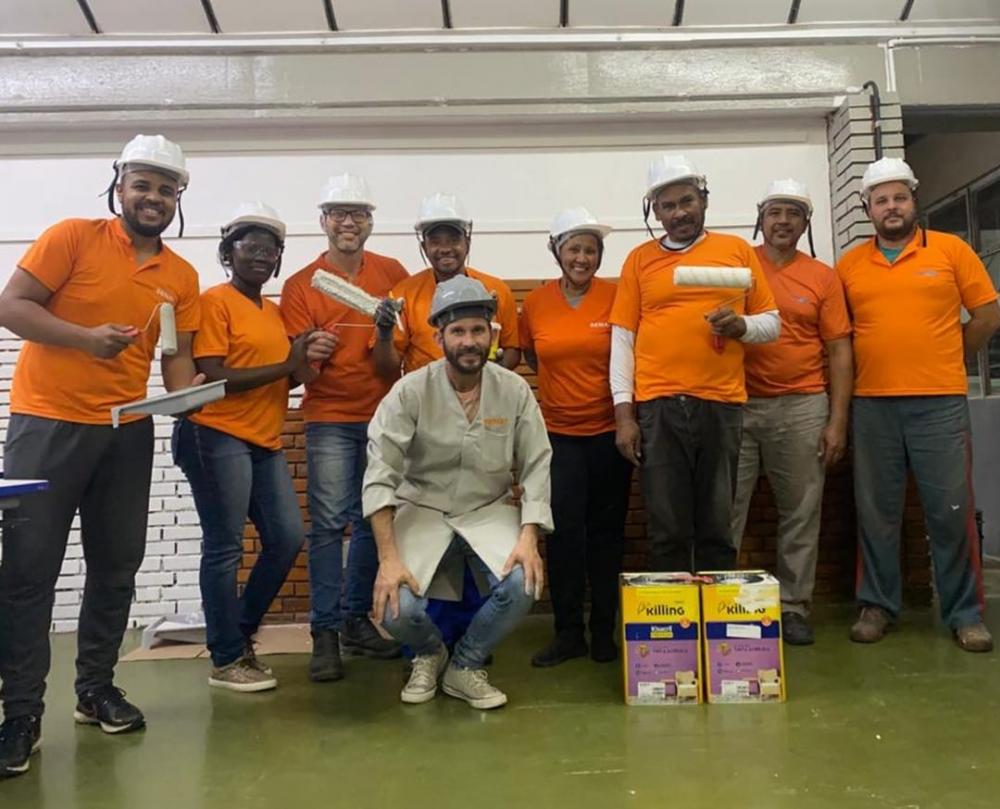 Participantes do curso de Pintor de Obras Imobiliárias estão fazendo a pintura das salas de aula, o reparo de paredes e a revitalização dos espaços comuns.