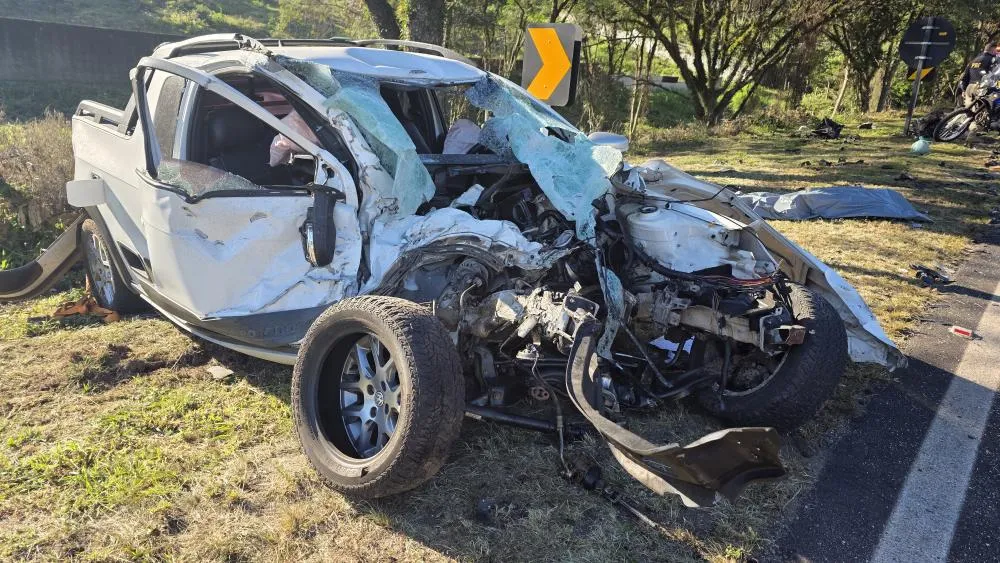 Homem de 53 anos perdeu a vida ao colidir uma Saveiro contra um caminhão na manhã deste sábado, 3 de maio.