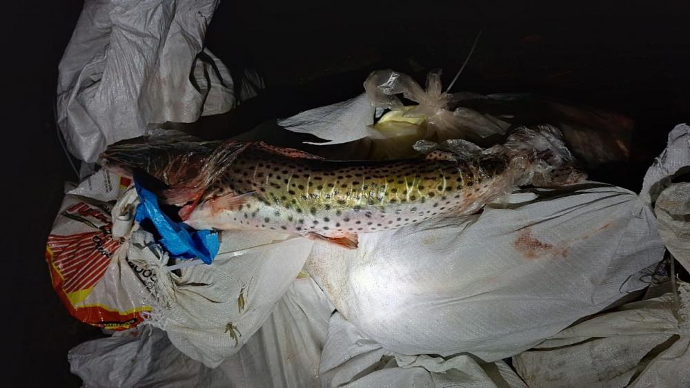 Dois homens, de 41 e 48 anos, foram flagrados com os animais, oriundos de pesca ilegal, e uma motoserra sem registro.