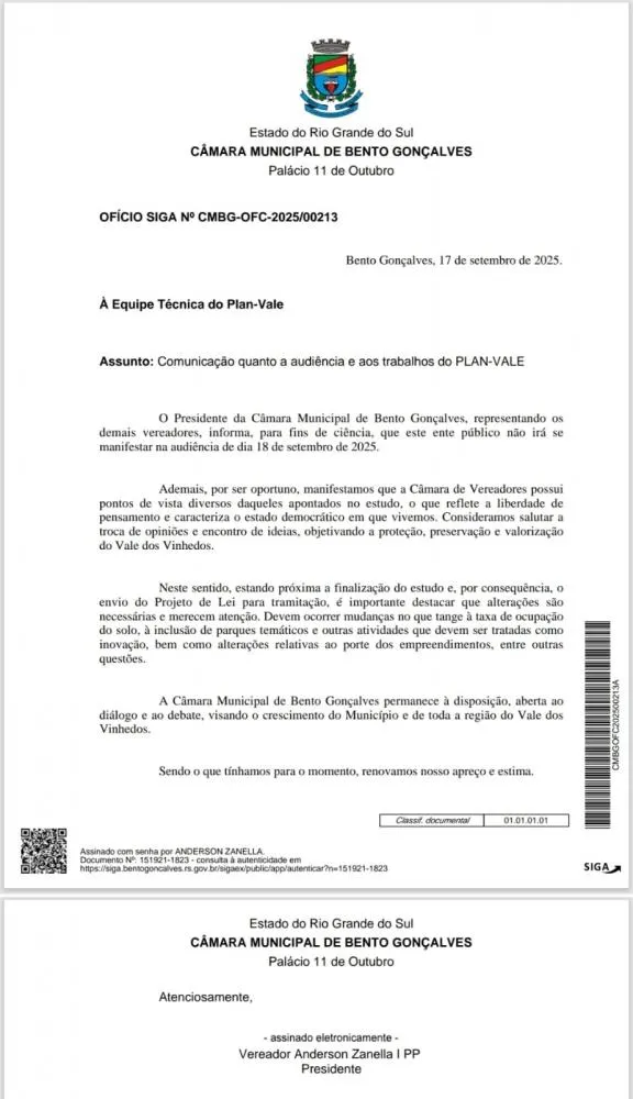 A questão é que não cabe ao presidente falar por todos. Vereadores como Moisés Scussel (MDB) e Volmar Giordani (Republicanos) já afirmaram que não compartilham dessa posição e que votarão de acordo com o desejo dos moradores do Vale. O documento, portanto, mais parece uma carta de intenções pessoais de Zanella do que uma manifestação institucional.