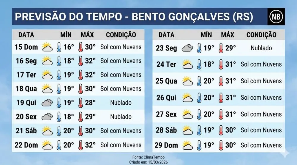 O outono se aproxima no calendário, mas o verão ainda mostrará toda a sua força na Capital do Vinho. Após uma semana de temperaturas agradáveis, uma nova onda de calor promete elevar os termômetros e mudar a rotina dos moradores de Bento Gonçalves. Segundo o levantamento divulgado pelo portal Climatempo, a cidade enfrentará um período prolongado de cerca de 10 dias seguidos de muito sol e calor intenso.