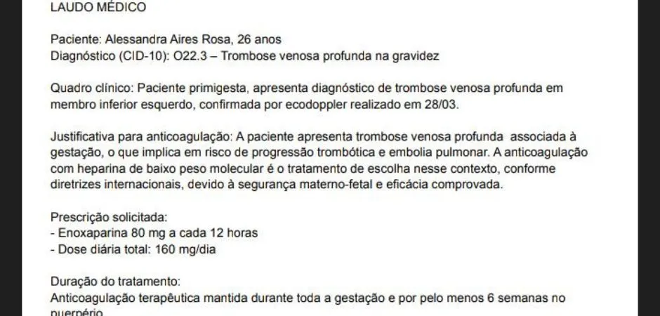 Aos oito meses e meio de gestação, o que deveria ser um período de doce espera transformou-se em uma corrida contra o tempo para Alessandra Aires Rosa. Diagnosticada com trombose gestacional na 28ª semana de gravidez, a jovem de 26 anos depende de quatro aplicações diárias de Enoxaparina Sódica (Versa) para garantir a sua vida e a do bebê, previsto para chegar ao mundo em 14 de junho. No entanto, o alto custo do remédio e entraves burocráticos colocaram a família em uma situação de extremo desespero.