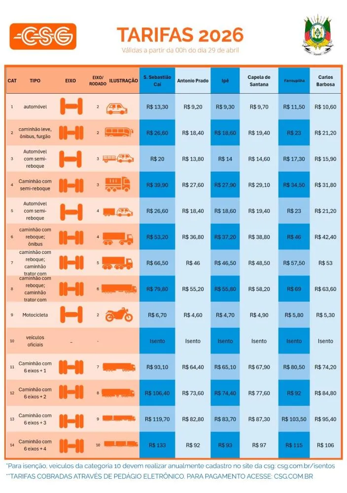 Para veículos de categoria 1, os novos valores passam a ser os seguintes: São Sebastião do Caí, de R$ 13,00 para R$ 13,30; Antônio Prado, de R$ 9,10 para R$ 9,20; Ipê, de R$ 9,10 para R$ 9,30; Capela de Santana, de R$ 9,50 para R$ 9,70; Farroupilha, de R$ 11,30 para R$ 11,50; e Carlos Barbosa, de R$ 10,40 para R$ 10,60. A CSG informa que os valores seguem as regras do contrato de concessão e passam por fiscalização e homologação da agência reguladora.