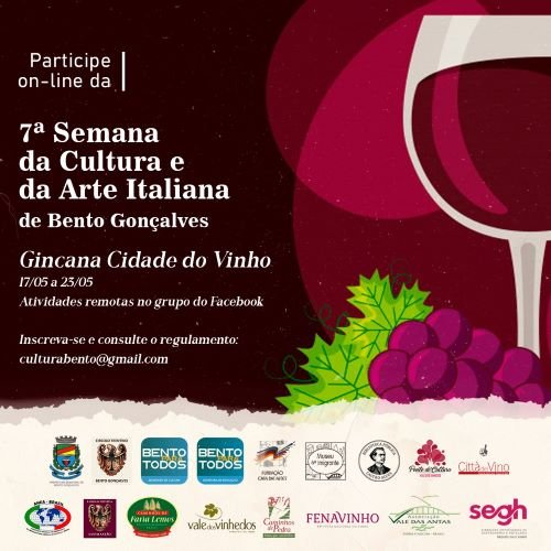 A partir do dia 17 de maio, Bento Gonçalves vivenciará a 7ª Semana da Cultura e da Arte Italiana. Com o lema “Uma semana para preservar nossas raízes, tradições e homenagear nossos antepassados”, a programação conta com diversas atrações, com destaque para a "Gincana Cidade do Vinho", ações culturais nas escolas, indicações diárias de livros sobre o tema, lives de apresentações musicais e de dança e de intercâmbio cultural.