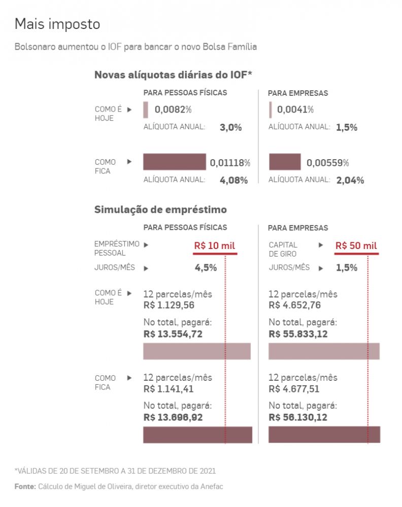 O presidente Jair Bolsonaro decidiu aumentar a alíquota de Imposto sobre Operações Financeiras (IOF) sobre operações de crédito para empresas e pessoas físicas já a partir da próxima segunda-feira, 20. O dinheiro arrecadado será usado para bancar o Auxílio Brasil, programa proposto pelo governo para substituir o Bolsa Família.