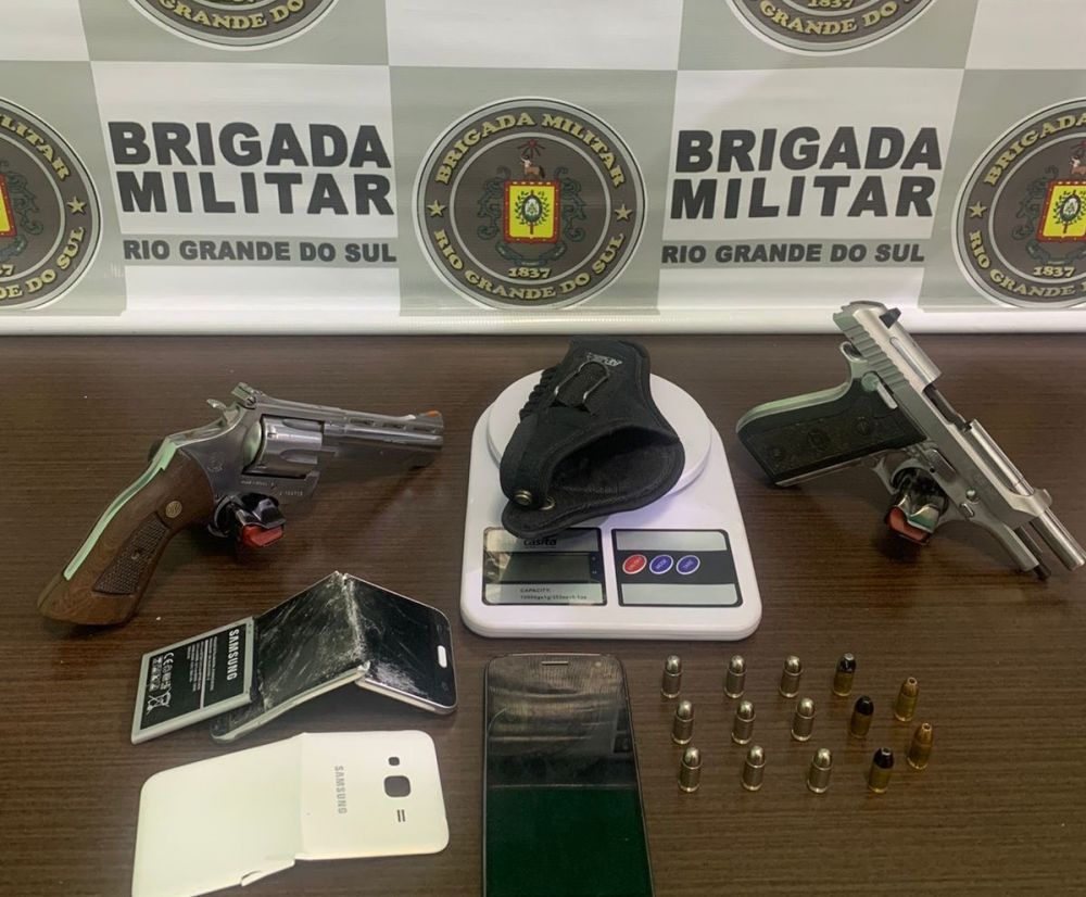 Os policiais começaram a fazer buscas na região e encontraram três suspeitos caminhando rapidamente nas proximidades. Com eles foram encontrados duas armas de fogo usadas no crime, uma pistola calibre 380, com dois carregadores e quatorze (14) munições do mesmo calibre, e um revólver calibre 38 e dois telefones celulares.