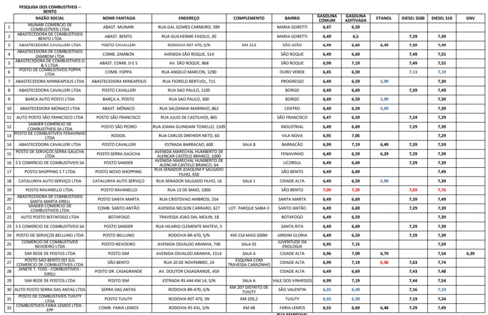 O Procon de Bento Gonçalves realiza a pesquisa semanal dos combustíveis e na semana passada ela foi realizada na quarta-feira, 29 de junho, justamente para conferir de quanto teria sido a redução do preço do litro do combustível na cidade. No dia 22 de junho, o preço mais baixo do litro da gasolina comum era de R$ 6,89. O litro da gasolina aditivada mais barato era de R$ 6,92.