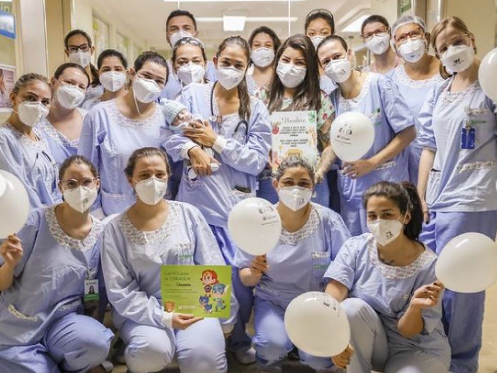 A equipe de profissionais do hospital preparou uma grande festa de despedida do bebê, que foia tendido por elas durante os mais de quatro meses de internação.
