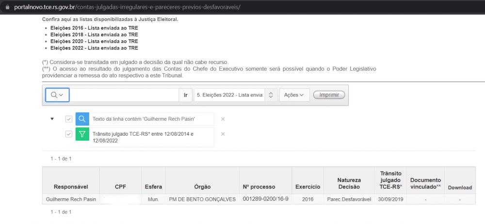 Os 321 citados na lista podem acabar ficando inelegíveis, por conta da Lei da Ficha Limpa, que prevê a inelegibilidade para quem for condenado por órgão colegiado. Nesta terça-feira (16), o TCE e o Tribunal Regional Eleitoral (TRE-RS) publicarão a íntegra da lista. Em seu último ano de seu primeiro mandato, em 2016, as contas do ex-prefeito tiveram parecer desfavorável pelo Tribunal de Contas. Os apontamentos foram nas contas de governo (as contas de gestão de Pasin foram aprovadas), envolvendo uma insuficiência financeira de R$ 26 milhões e também em ações que feriram a Lei de Acesso à Informação.