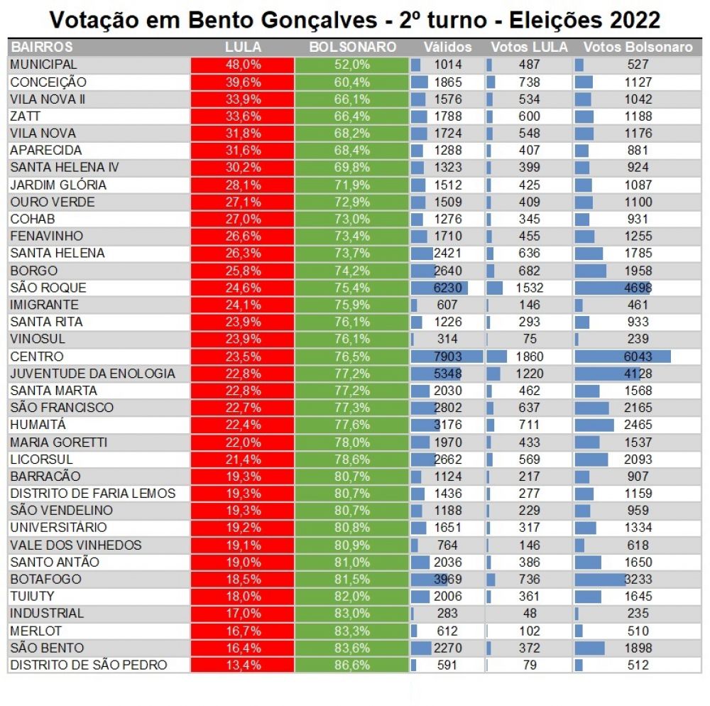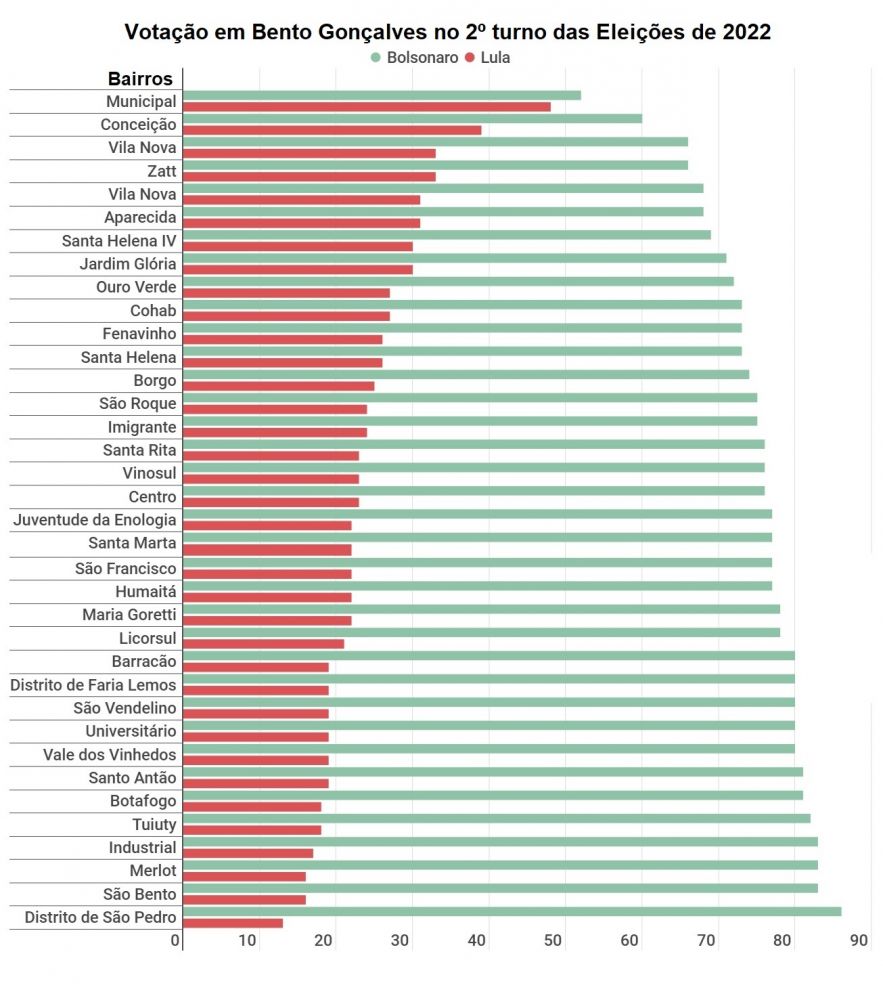 A localidade que teve maior porcentagem a favor do futuro presidente do Brasil foi o bairro Municipal, com 48% (487 votos) a favor do candidato petista contra 52% (527 votos) para Bolsonaro. Na sequência, os bairros Conceição, com 39,6%, e o Vila Nova II, com 33,9%, também estão entre as localidades com maiores pontos percentuais a favor de Lula em Bento Gonçalves.
