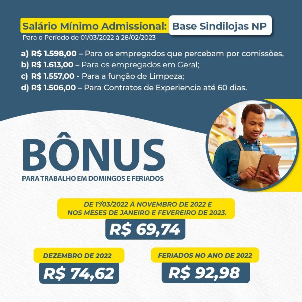 A presidente também frisa quais são os novos salários até final de fevereiro de 2023 para Bento, Carlos Barbosa e Garibaldi. “Com o reajuste, o salário mínimo admissional vigente entre 1º de março de 2022 a 28 de fevereiro de 2023 para empregados comissionados é de R$ 1.768,00; para empregados em geral o valor é de R$ 1.629; para a função de limpeza o salário inicial é de R$ 1.586,00; já para contratos de experiência – até 60 dias, o valor é de R$ 1.543,00. Ainda conforme o acordo, o bônus para trabalho aos domingos no período de 1ª de março a novembro de 2022 e nos meses de janeiro e fevereiro de 2023, a ser pago no final do expediente, é de R$ 68,95. No mês de dezembro, para o trabalho aos domingos, o bônus deve ser de R$ 75,35. No que diz respeito ao trabalho em feriados, o valor sobe para R$ 102,42,” esclarece Orildes.
