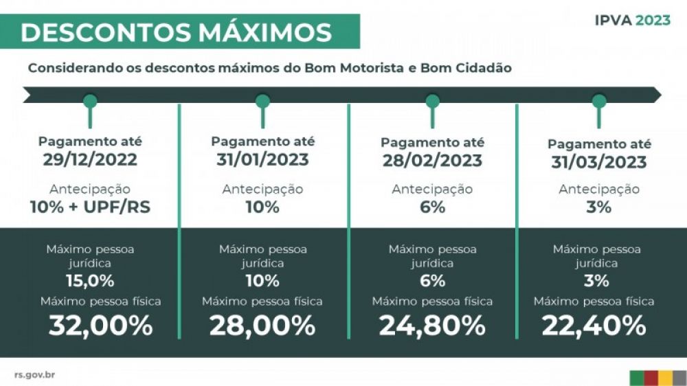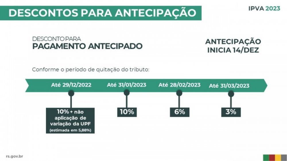 O pagamento com um desconto de 10% + UPF/RS (de 5,76%), estava disponível até a quinta-feira, dia 29 de dezembro. A partir do dia 30 de dezembro a 31 de janeiro de 2023, é possível quitar com apenas 10% de desconto. Se pagar o tributo até o dia 28 de fevereiro, a redução é de 6%, e pagando até 31 de março, o desconto é de 3%. Nesses casos, os valores já estarão atualizados pela variação da UPF.