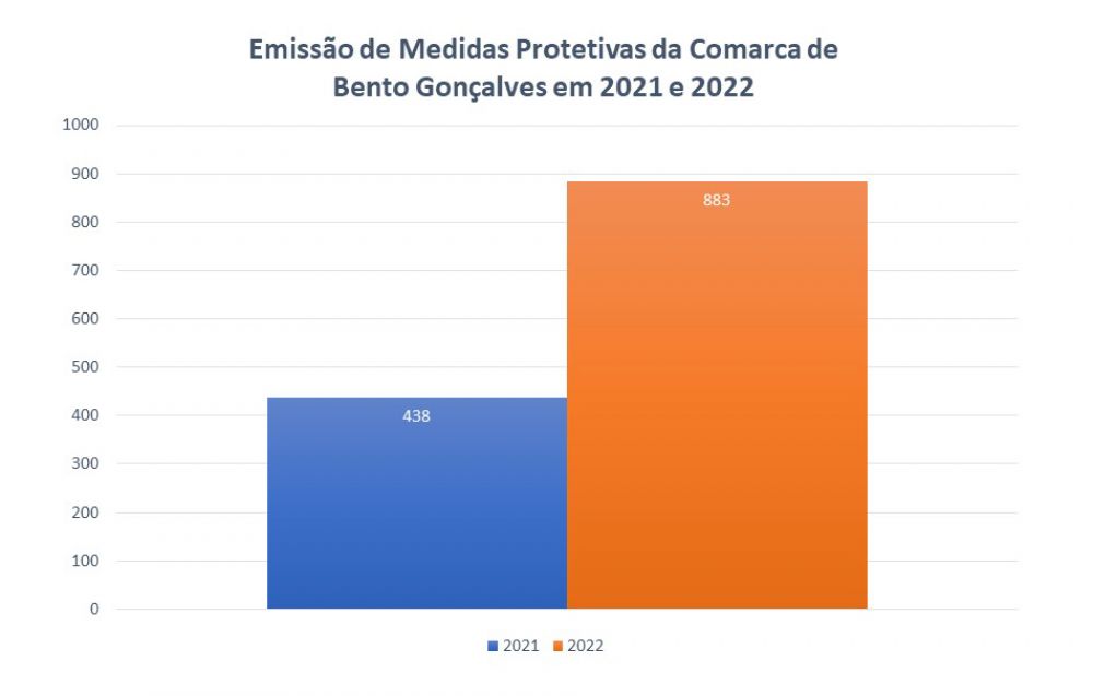 De acordo com os dados da Coordenadoria Estadual da Mulher em situação de Violência Doméstica e Familiar do Tribunal de Justiça do Rio Grande do Sul, em 2022 foram concedidas 883 medidas protetivas para moradoras de Bento Gonçalves, mais que o dobro de 2021 quando o número foi de 438 emissões. Já nos casos de ameaças, houve uma pequena queda, indo de 401 em 2021 para 334, contudo, nos registros de lesões corporais aumentou 28 casos, indo de 226 para 254; e nos crimes de estupro uma crescente de 10 ocorrências, saindo de 23 para 33 casos.