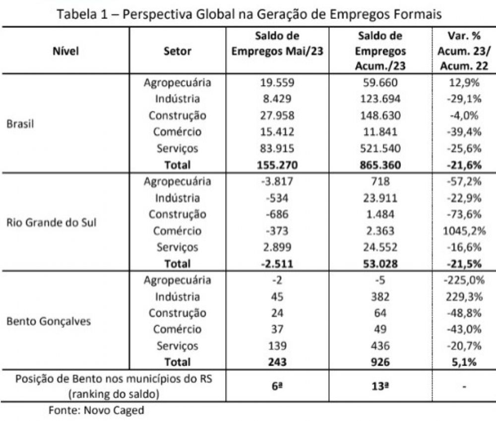 Bento Gonçalves finalizou o mês de maio com a geração de 243 postos de trabalho – 42 a menos do que em abril, quando obteve a 10ª melhor performance no Estado. De acordo com o estudo, baseado nos dados do Novo Caged e do Sinac, o setor de serviços foi quem mais contribuiu para os números positivos, com a criação de 139 vagas. Indústria, com 45, e comércio, com 37, vêm na sequência, com construção civil registrando 24. “As atividades que se destacaram foram atenção à saúde humana (33), transporte terrestre (32), indústria de borracha e plástico (27) e farmácias (25)”, destaca o autor do boletim, Fabiano Larentis.