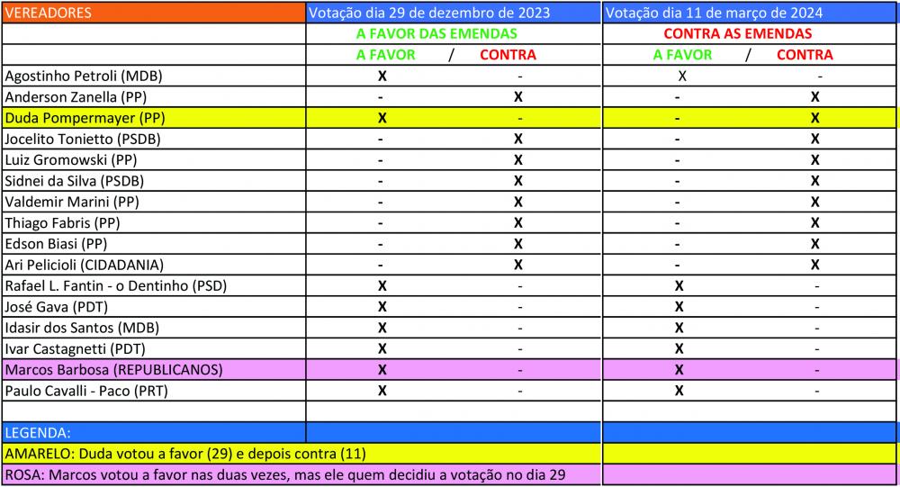 Como ocorreu na votação das emendas no dia 29 de dezembro de 2023, com a mudança do voto de Marcos Barbosa (REPUBLICANOS) a favor da proposta de Rafael Pasqualotto (atualmente do partido PL), o posicionamento de Duda Pomperpayer (PP) também foi essencial para que as sugestões, agora, fossem rejeitadas. Na sessão do ano passado, o professor estava do lado das emendas, mas nesta segunda-feira, 11, decidiu trocar o seu voto. Nos bastidores, é falado que a alteração foi baseada em uma "troca de favores" entre o vereador e o Prefeito Diogo Siqueira (Leia mais aqui).