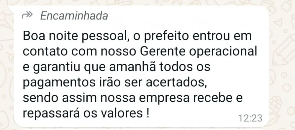 A informação causou apreensão entre os trabalhadores, que ficaram sem o benefício essencial para o sustento diário. Entretanto, no dia seguinte, uma nova mensagem do encarregado da empresa trouxe um alívio temporário, informando que o prefeito Diogo Siqueira havia entrado em contato com a gerência operacional da Nascimento Serviços de Limpeza e garantido que todos os pagamentos seriam acertados em breve. “O prefeito entrou em contato com nosso Gerente operacional e garantiu que amanhã todos os pagamentos irão ser acertados, sendo assim nossa empresa recebe e repassará os valores!”, destacou a mensagem. Porém, até as 10h30min desta terça-feira, 20 de agosto, o dinheiro não tinha entrado na conta dos trabalhadores.