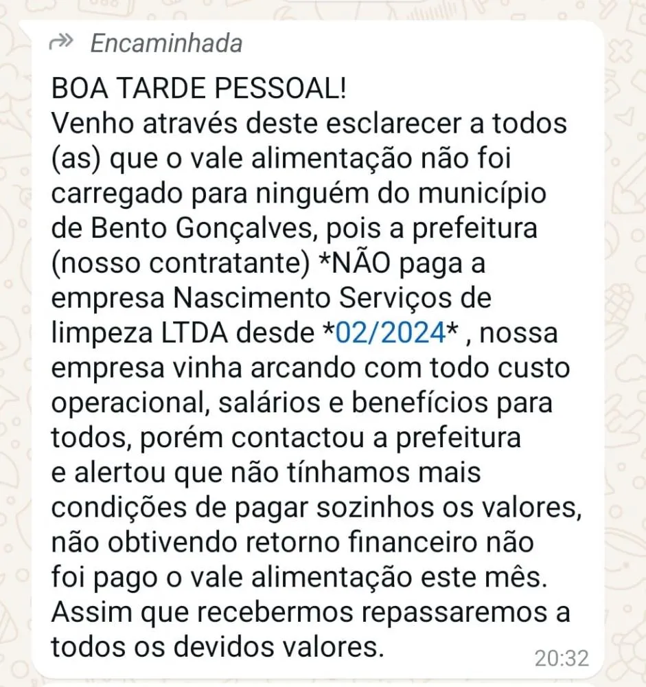 No comunicado enviado aos funcionários em um grupo de Whatsapp, a empresa afirmou que, apesar de estar arcando com todos os custos operacionais, salários e benefícios, chegou ao limite de sua capacidade financeira sem o recebimento dos pagamentos devidos pela prefeitura. “A prefeitura (nosso contratante) não paga a empresa Nascimento Serviços de Limpeza Ltda desde fevereiro de 2024. Nossa empresa vinha arcando com todo custo operacional, salários e benefícios para todos, porém alertou a prefeitura que não tínhamos mais condições de pagar sozinhos os valores. Não obtendo retorno financeiro, não foi pago o vale-alimentação deste mês. Assim que recebermos, repassaremos a todos os devidos valores”, afirmou o comunicado.