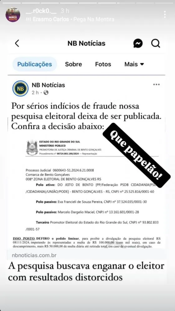 A jornalista Mônica Rachele, apresentadora e ligada à Coligação Do Jeito de Bento, foi flagrada pelo diretor do NB, Marcelo Dargelio, fazendo publicação falsa em um grupo de Whatsapp chamado Na Mira das Notícias, com o objetivo de espalhar a falsa informação de que a pesquisa encomendada pelo NB Notícias era fraudulenta. Na postagem, publicada às 16h43min, ela escreve "Essa é a sede da "empresa" de pesquisa que o NB contratou". Alguns segundos após a publicação, a jornalista apagou o comentário e a imagem publicada. O material foi printado a tempo e será utilizado em processo judicial contra a profissional.