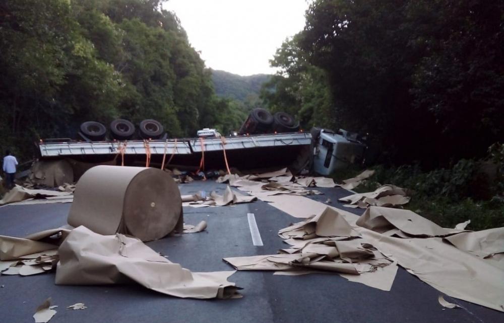 Veículo carregado com bobinas ficou sem freios e fez um "L", atingindo um automóvel no quilômetro 8 da rodovia.