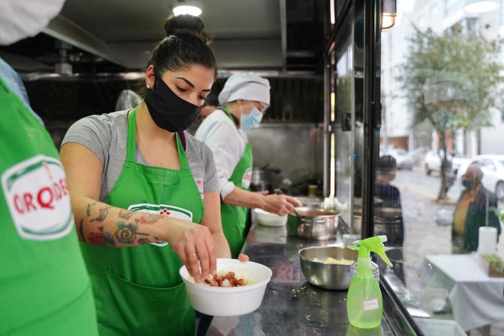 Na rua, a pé ou de carro, quem comprou o almoço ia chegando aos poucos e retirando seu kit na Praça Loureiro da Silva, no Centro Histórico de Garibaldi.