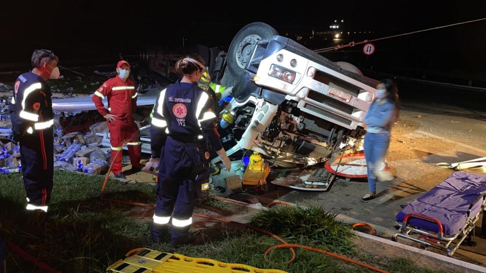 Condutor perdeu o controle de um caminhão carregado com caixas de leite e tombou o veículo no acesso à rodovia.
