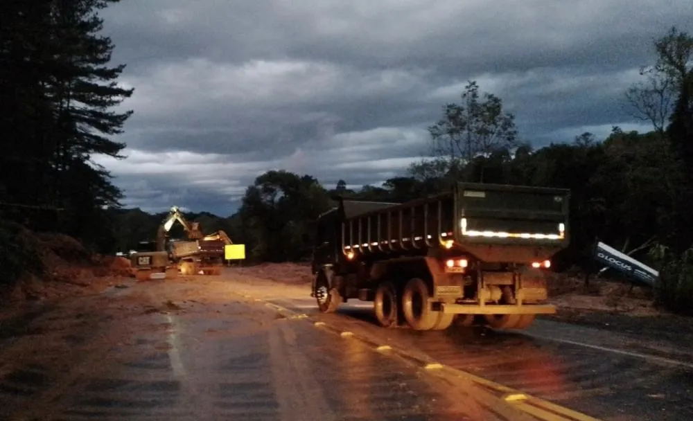 Deslizamento foi registrado no quilômetro 232 da rodovia e o tráfego de veículos está bloqueado nos dois sentidos.