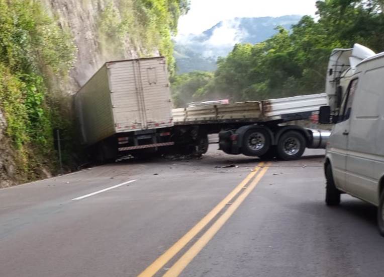 Carreta bloqueava o trânsito após perder o controle e colidir quando uma carreta sem freio bateu contra o veículo e o paredão de pedras.