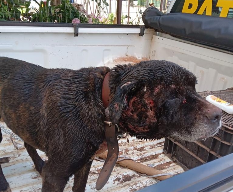 Cão que foi resgatado se encontrava significativamente machucado, com ferimentos graves na cabeça e no pescoço