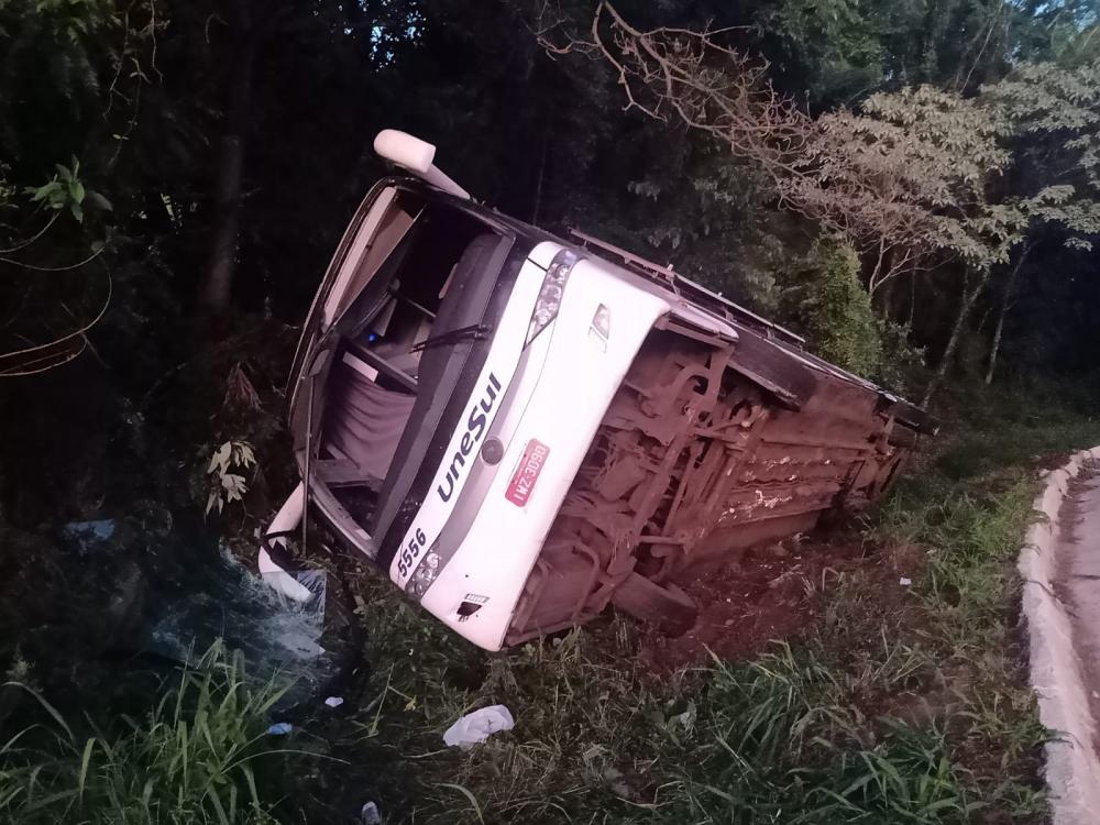 Veículo da empresa Unesul vinha para Caxias do Sul, quando tombou na BR 480 entre os municípios de Erechim e Barão de Cotegipe.